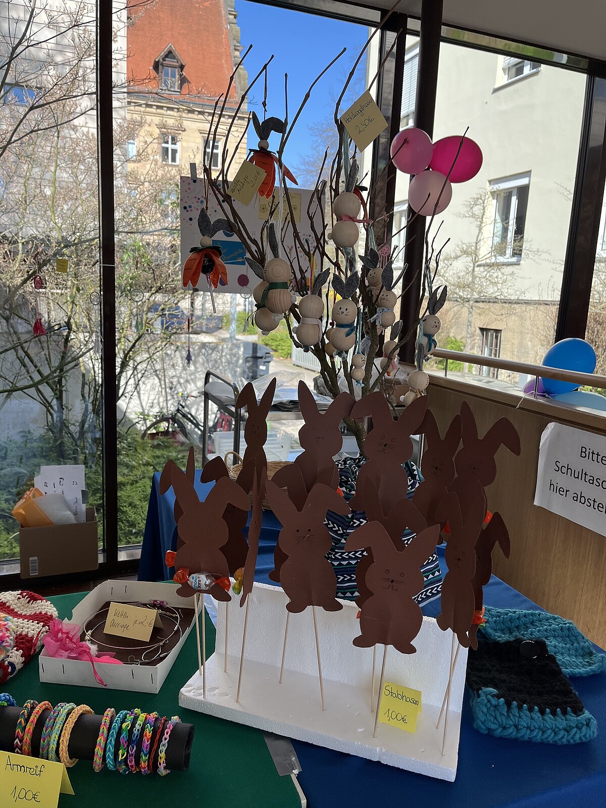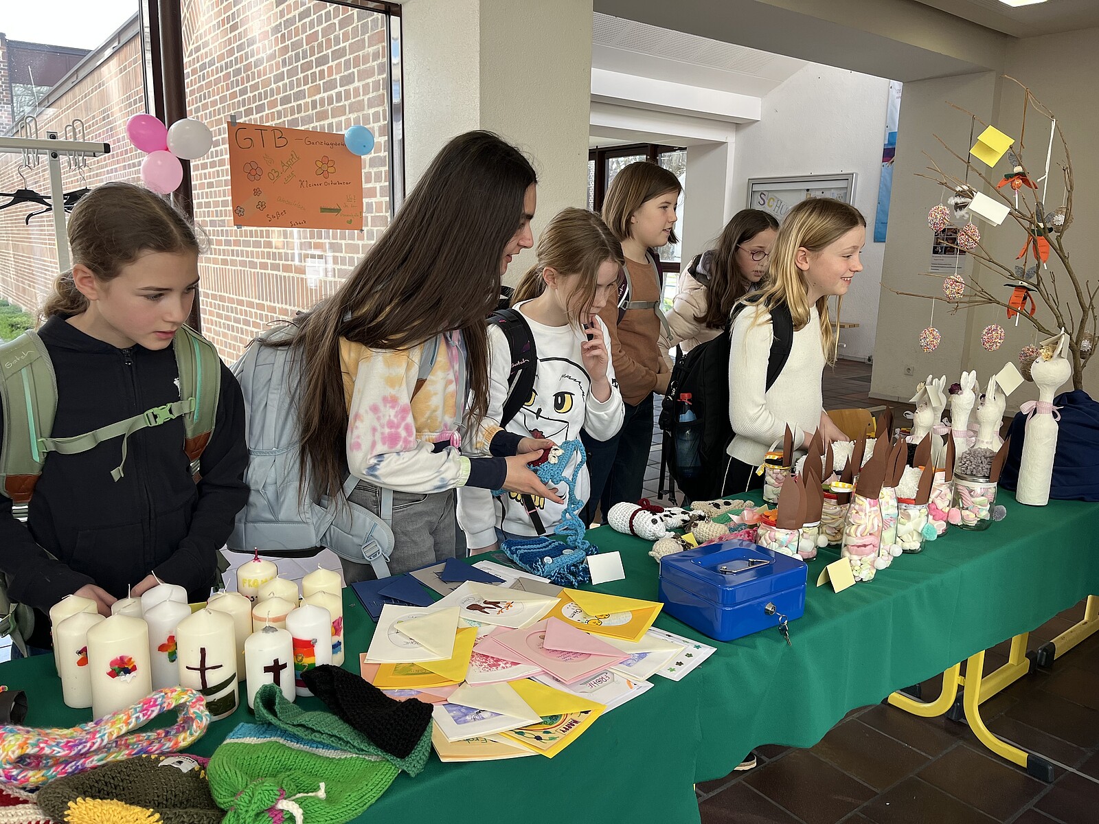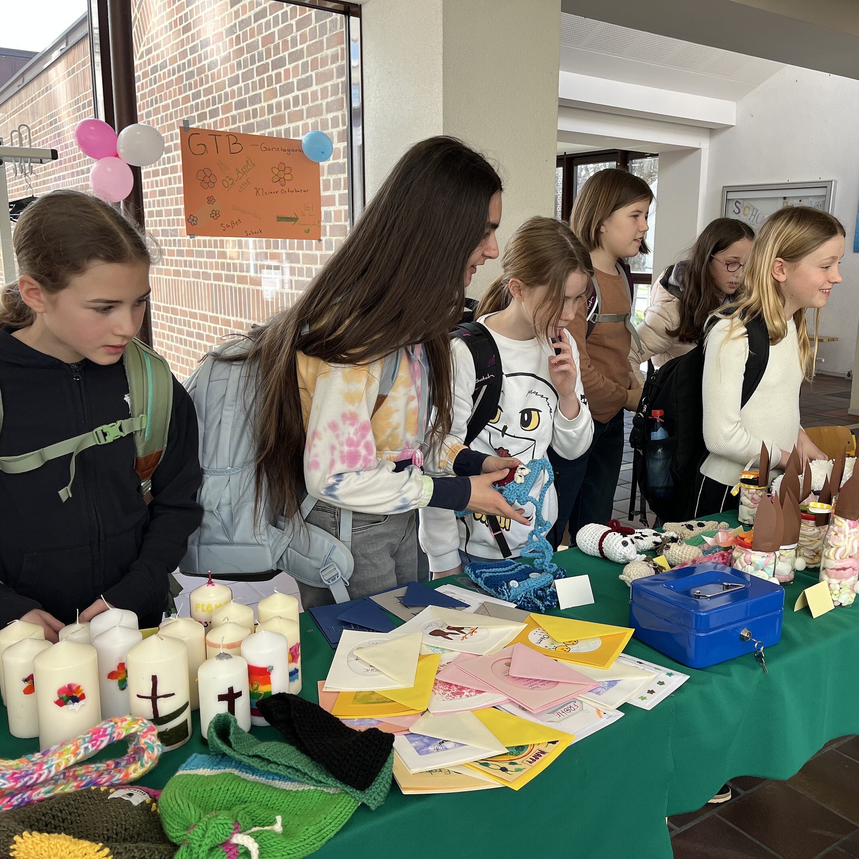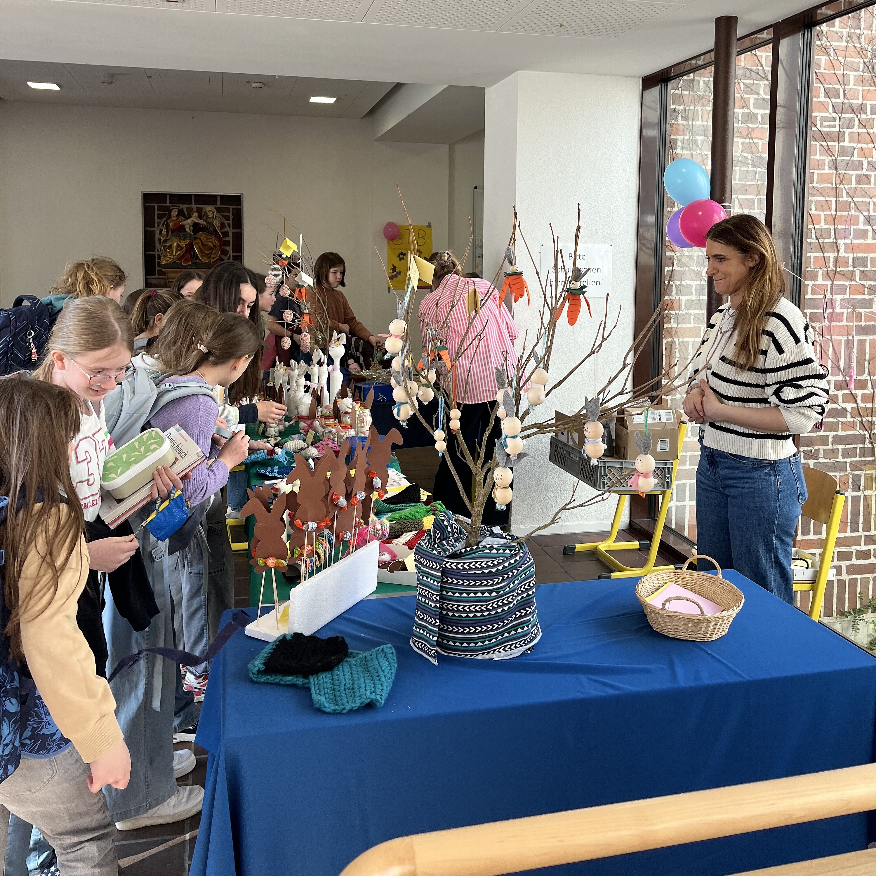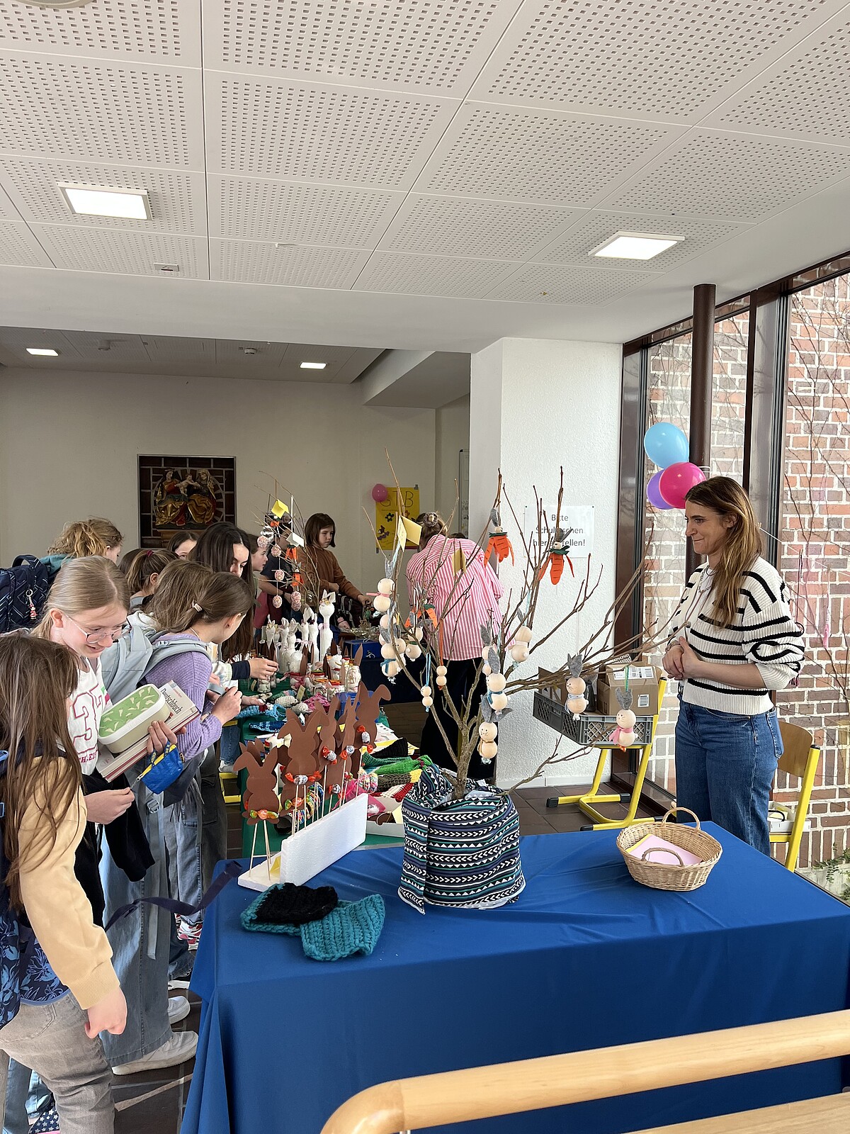 Der Osterbasar der Ganztagsschule brachte frühlingshafte Stimmung in die Aula. An einem liebevoll gestalteten Verkaufsstand boten die Schülerinnen eine große Auswahl an selbstgebastelten Osterdekorationen und Leckereien an.