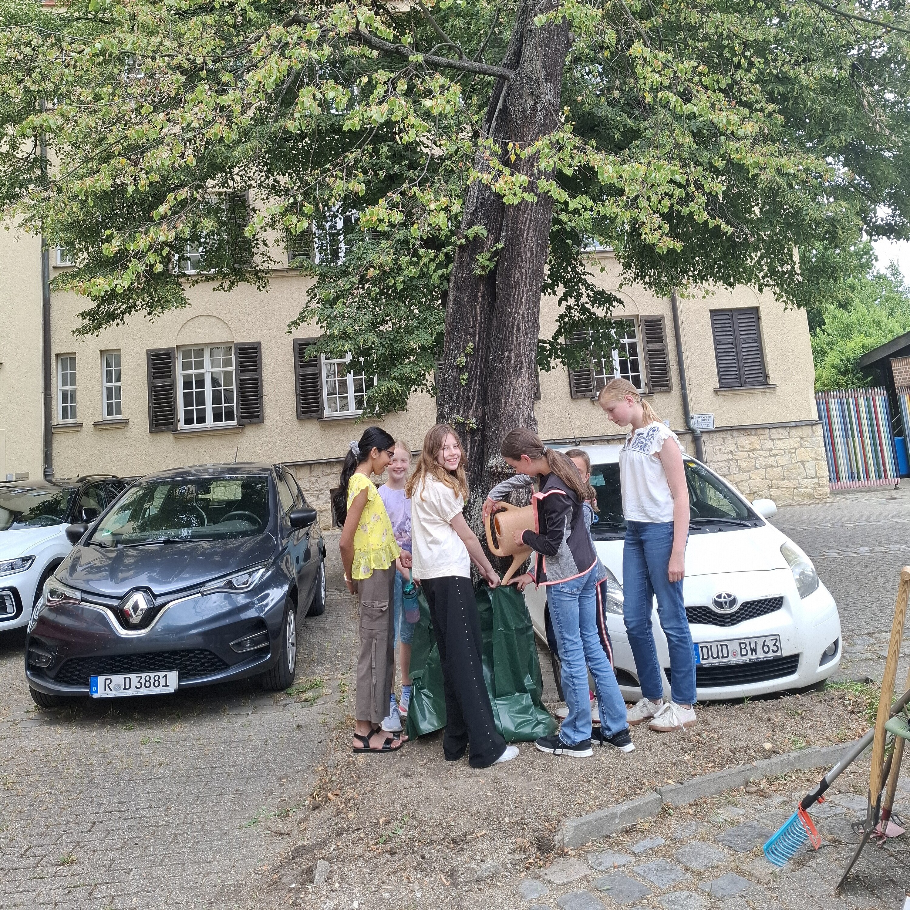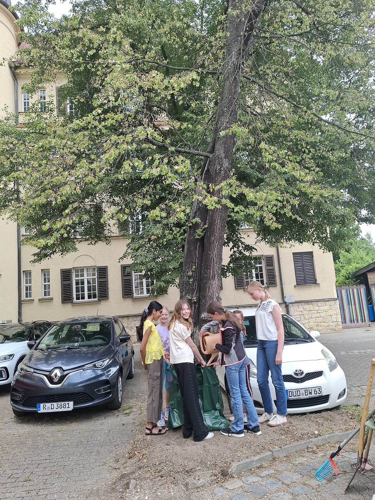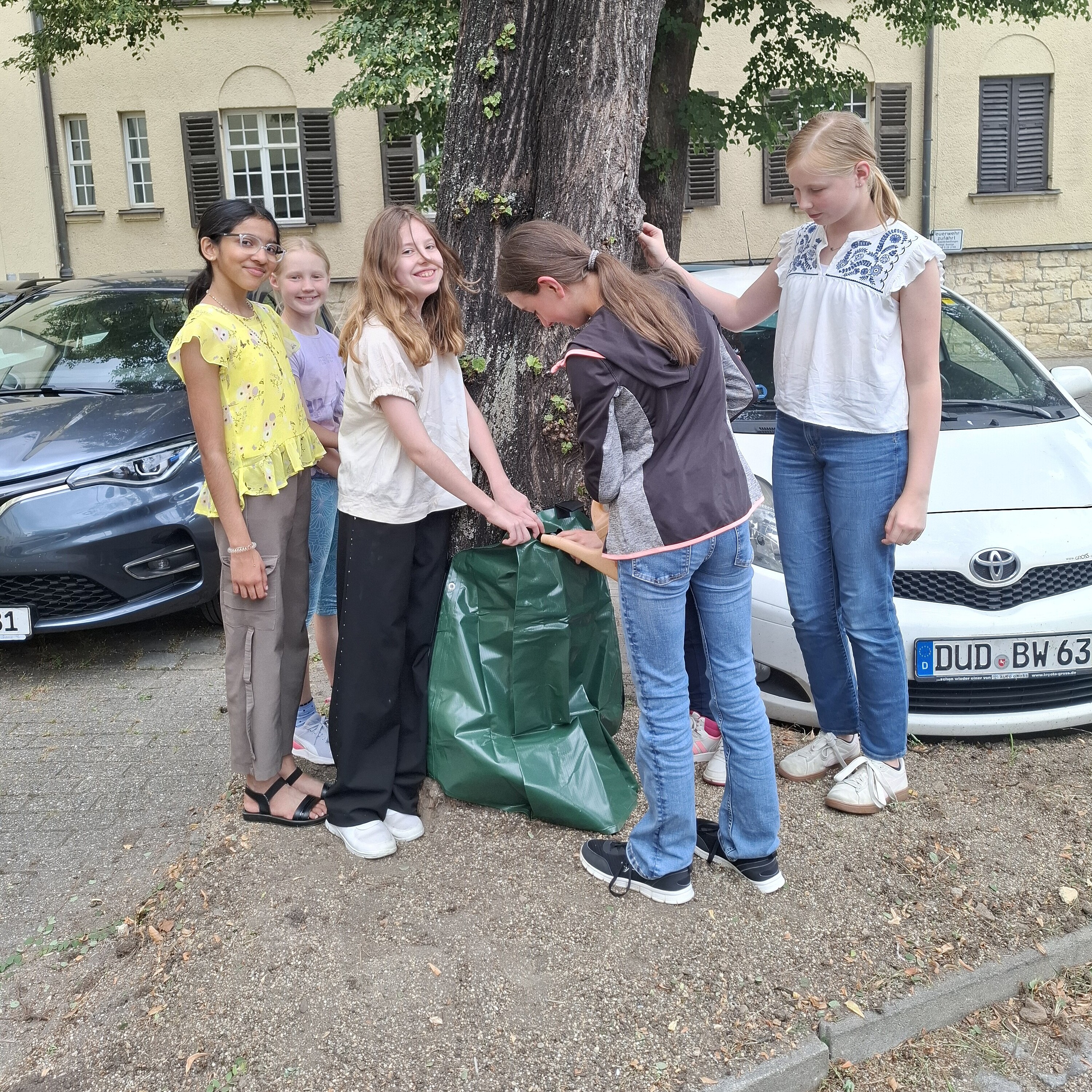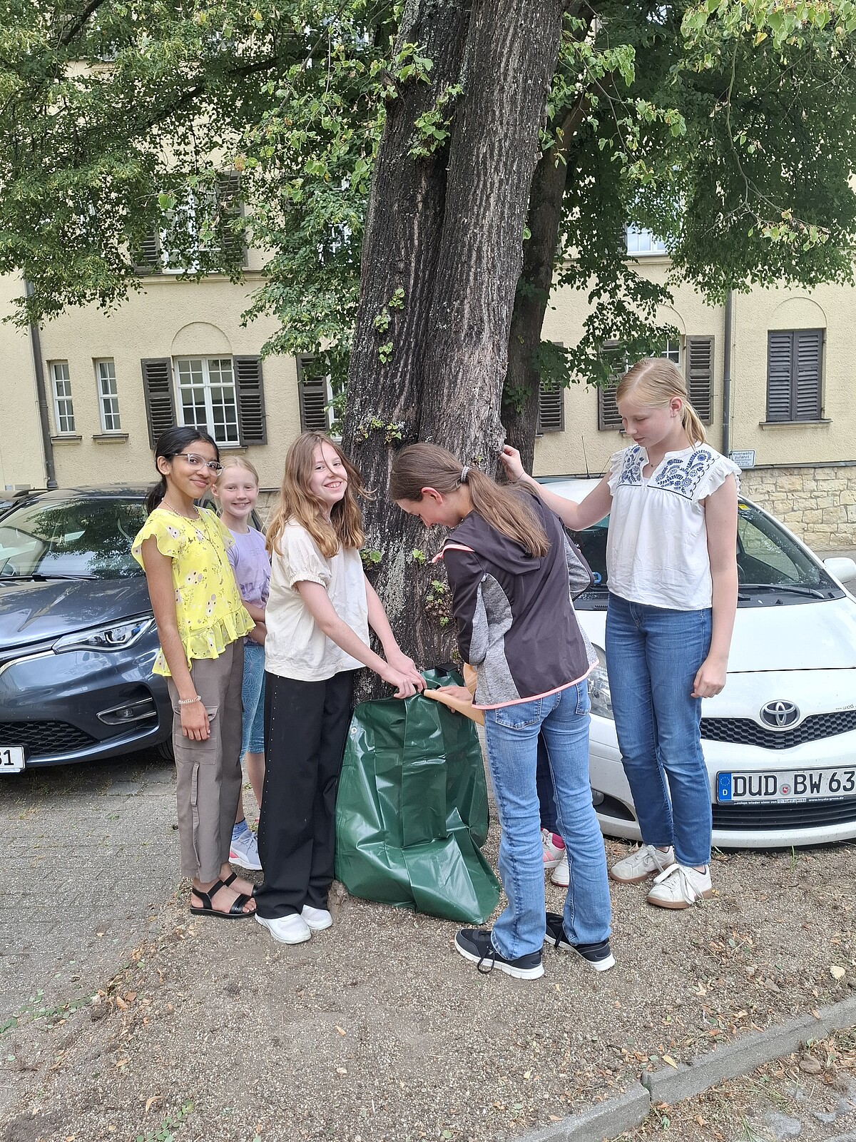 Die Mädchen vom Wahlfach Klostergarten haben den Bewässerungssack an der Linde angebracht und mit Wasser befüllt.