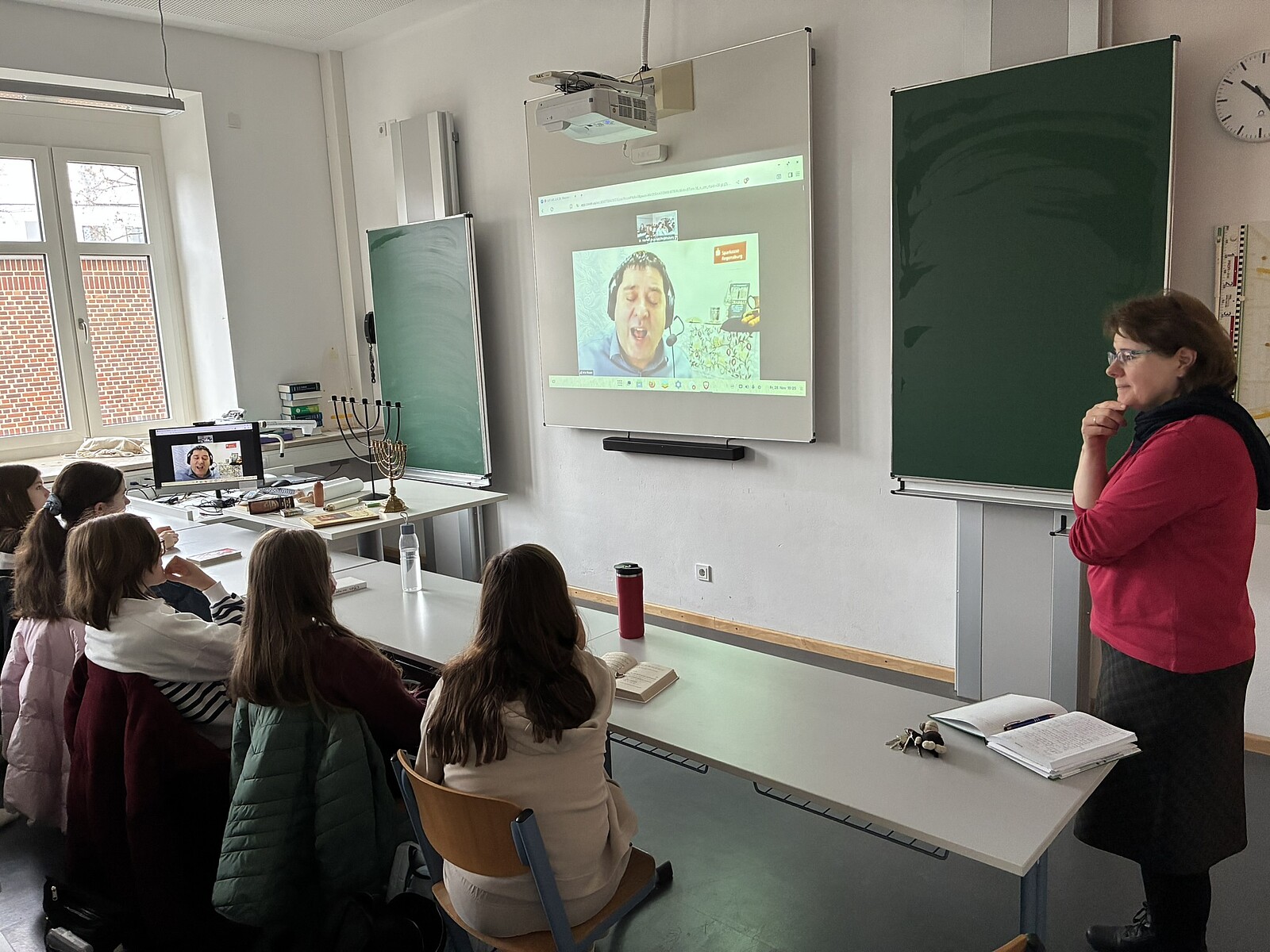 Der live aus Jerusalem in das Klassenzimmer der „Englischen“ gestreamte Herr Ariel Rosen staunte zunächst nicht schlecht, als er von den sangesfreudigen Schülerinnen mit einen „Hewenu shalom alechem“ aus Bayern begrüßt wurde. Dann aber wurde ihm volle Aufmerksamkeit zuteil, als er gekonnt in die bis dato weitgehend fremde Welt des Judentums einführte. Sogar eine digitale Erfahrung des Ablaufes eines „Schabbatabends in der Familie Rosen in Jerusalem“ wurde ermöglicht. Dabei zeigte der digital perfekt vernetzte Referent, wie eng christliche Traditionen mit dem jüdischen Erbe vernetzt sind, da sie größtenteils aus der Wurzel des für Christen sogenannten Alten Testaments stammen.