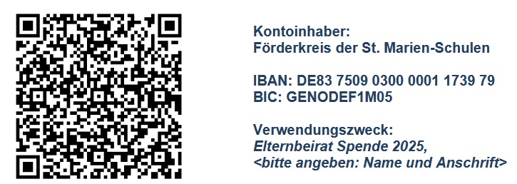 Wenn Sie sich über den aktuellen Spendeneingang informieren wollen, sehen sie auf unserer Homepage nach: Wir aktualisieren hier die Spendeneingänge bis zum 31.12.2025: www.st-marien-schulen-regensburg.de/schulfamilie/elternbeirat