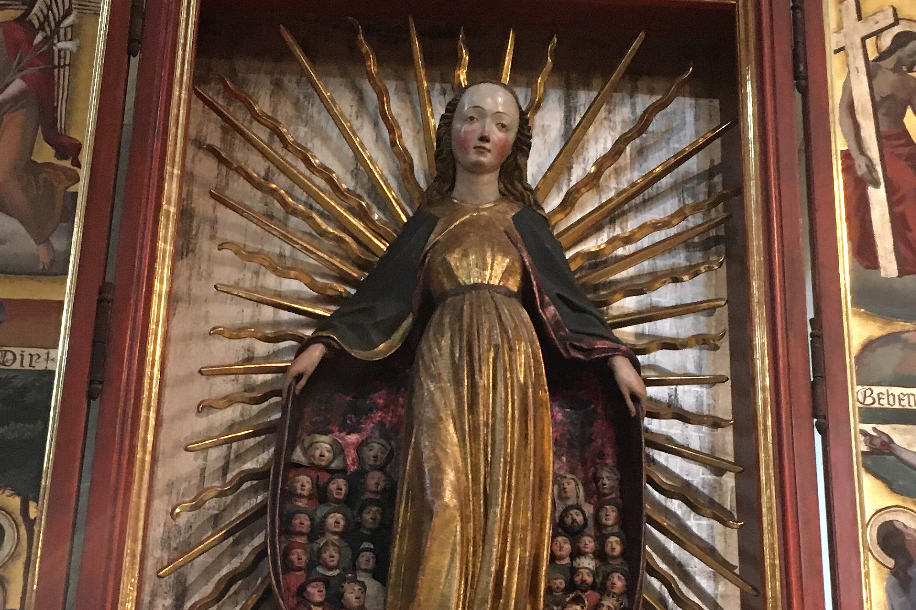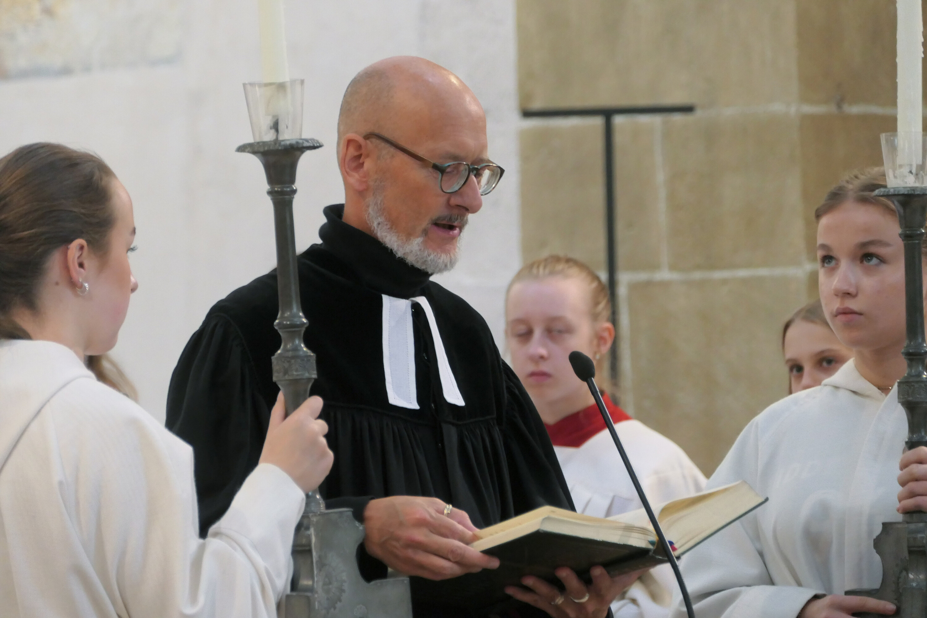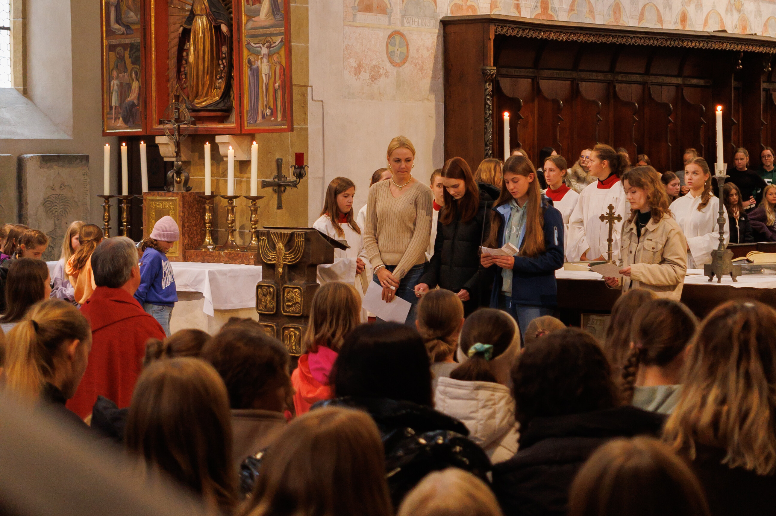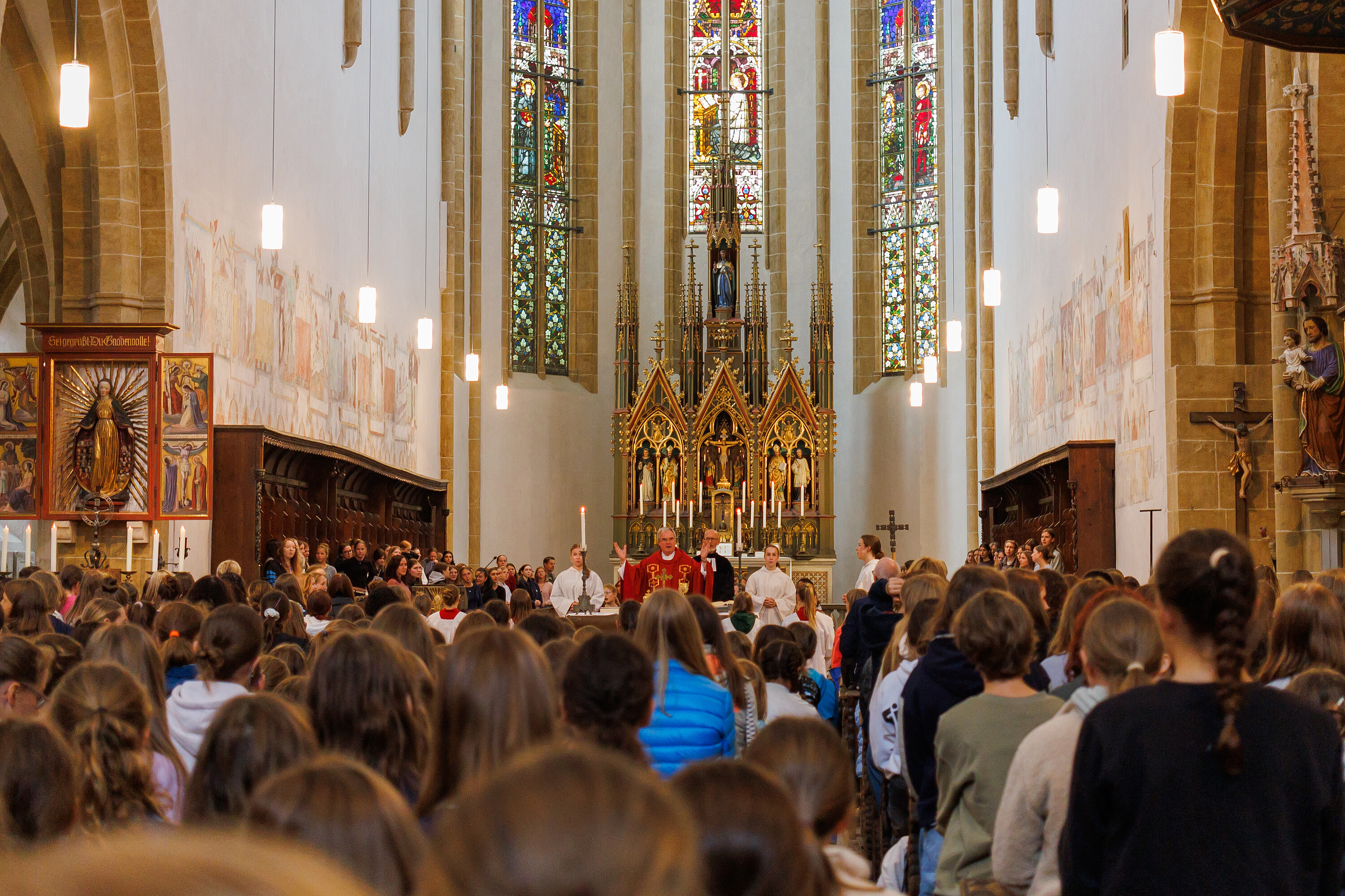 Nach vielen Jahren startete die Schulfamilie der „Englischen“ wieder mit einer Eucharistiefeier in der frisch renovierten Dominikanerkirche. Die mehr als 1000köpfige Gottesdienstgemeinschaft begrüßte dabei den neuen Schulleiter OStD Markus Birner in ihrer Mitte. Symbolisch für die Schülerinnen übergab Domvikar Andreas Albert dem neuen Direktor ein Schatzkästchen mit Goldstücken. Diesen Schatz gelte es in den nächsten Jahren zu hüten, pflegen und mehren! Oberstudiendirektor Birner zeigte sich beeindruckt von der gewaltigen Schulfamilie und versprach sein Bestes! Der Gottesdienst wurde von den Chören der St. Marien-Schulen u.a. mit der Mary-Ward-Messe unter der Leitung von Angelika Wimmer und Maestro Thomas Humbs an der Orgel eindrucksvoll gestaltet. Zahlreiche Ministrantinnen, Leserinnen aus der G 10A, Pfarrer Müller und Schulseelsorger Andreas Albert führten durch die Liturgie zu Ehren der Schutzfrau Maria, der die St. Marien-Schulen vom Jahr 1903 an geweiht sind. Dabei verwies Pfarrer Albert in der Predigt darauf, dass die Dominikanerkirche in Regensburg der ältesten Bildungseinrichtung der Bischofsstadt entspricht. Bereits im 13. Jahrhundert hatte hier der hl. Albertus Magnus als Universalgelehrter seinen Lehrstuhl. Später wurde in dieser Tradition angrenzend das “Alte Gymnasium“ (heute Albertus-Magnus Gymnasium) gegründet, das ursprünglich nur Knaben offen stand. Seit 1916 an unserer Schule das erste Abitur an einer Mädchenschule in Bayern abgelegt wurde, stehen unsere Mädels dem sowohl im Gymnasium als auch in der Realschule in nichts nach. Dabei wurde zu allen Zeiten Maria als Patronin angerufen, unter deren Schutzmantel Regensburgs Lernende und Lehrende gut durch die – nicht immer einfachen – Zeiten gekommen sind. Abschließend überreiche Domvikar Albert dem neuen Schulleiter eine Kopie des Gnadenbildes in der Dominikanerkirche mit dem Wunsch einer guten und erfüllten Zeit an nunmehr „seinen Englischen“!