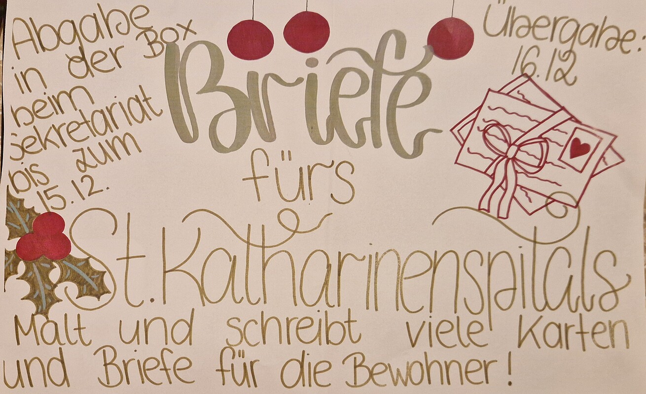 Zusammen mit unserer Wertebotschafterin Annalena Happacher konnten am 17.12.25 29 Schülerinnen der R 5A und R 5C zusammen mit ihren Lehrerinnen Frau Lorenz und Frau Wiethaler nach Unterrichtsschluss das St. Katharinenspital besuchen. Bei Punsch und Plätzchen wurden sehr nette Gespräche mit den 16 Heimbewohnern geführt, Erfahrungen ausgetauscht und gemeinsam Weihnachtslieder gesungen. Besonders freuten sich die Senioren auch über die 250 liebevoll gestalteten Briefe aller unserer Schülerinnen, die wir bei diesem Anlass übergeben durften. Im Namen aller Heimbewohner ein ganz herzliches Dankeschön an alle fleißigen Weihnachtspostschreiberinnen! Wir werden die seit 2006 bestehende Tradition sehr gerne auch im nächsten Jahr weiterführen.