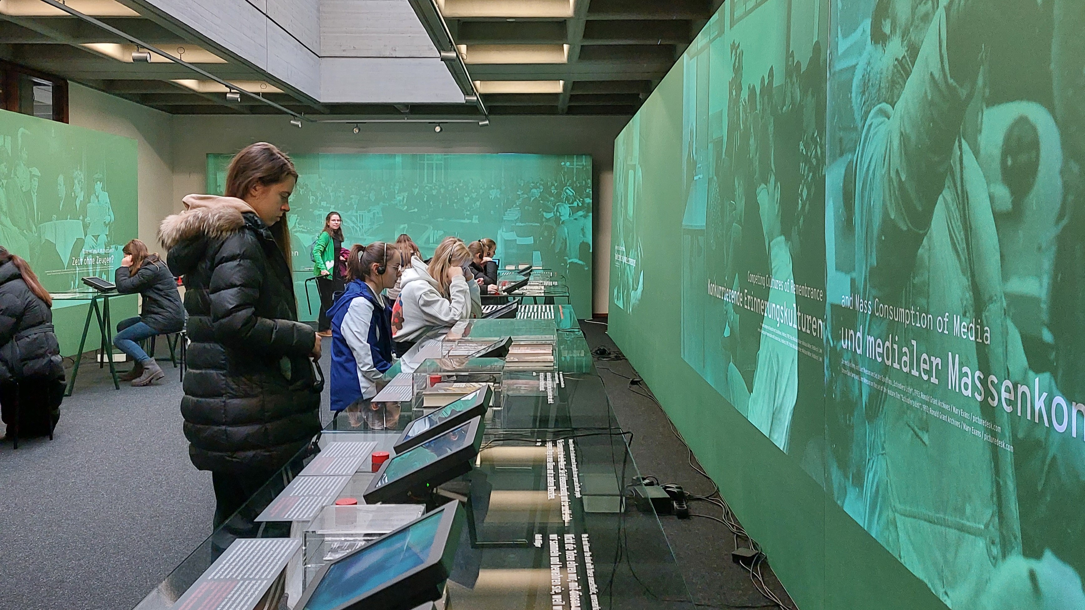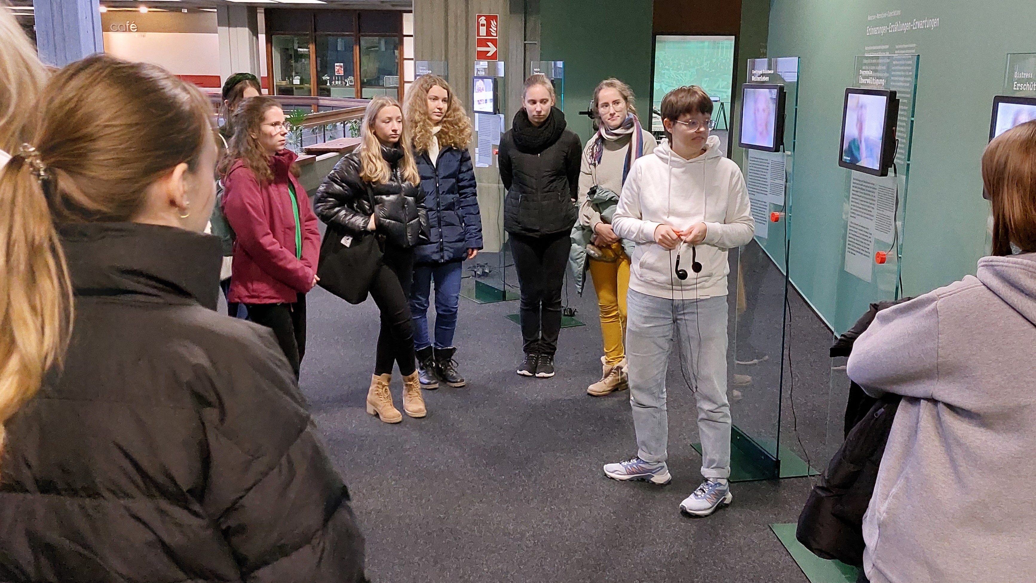 Im Rahmen des Geschichtsunterrichts besuchte die G 9A im Dezember 2023 die Ausstellung „Ende der Zeitzeugenschaft?“ an der Universität Regensburg. Die KZ-Gedenkstätte Flossenbürg und das Jüdische Museum Hohenems als Veranstalter machten es sich vor Ort zur Aufgabe, den Umgang mit Zeitzeugeninterviews und -berichten in den letzten Jahrzehnten kritisch zu betrachten. Gleichzeitig gaben sie den Besuchern die Frage mit auf den Weg, inwiefern Berichte Überlebender der NS-Zeit in Zukunft genutzt werden können, vor allem da sie bald nur noch in schriftlicher oder digitaler Form vorliegen werden. Eine Führung durch die Ausstellung brachte den Schülerinnen Erzählungen von Holocaust-Überlebenden näher und eröffnete so einen tieferen Einblick in den Umgang mit traumatischen Erfahrungen. Gezielt wurde der Fokus daraufgesetzt, in welchem Umfeld Zeitzeugen zu ihren Erlebnissen befragt wurden und welche Auswirkungen dies auf die Befragten hatte. Den Schülerinnen wurde klar, welch unschätzbar hohen Wert Berichte von Zeitzeugen, vor allem von Opfern der Gräueltaten der Nationalsozialisten, für die Erinnerung an die NS-Zeit haben.