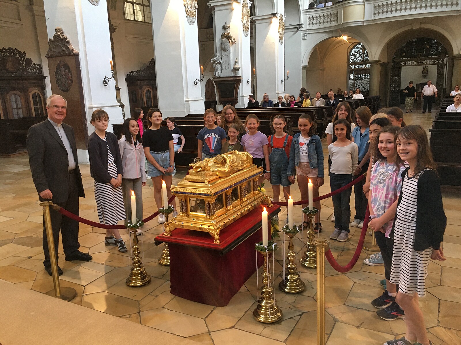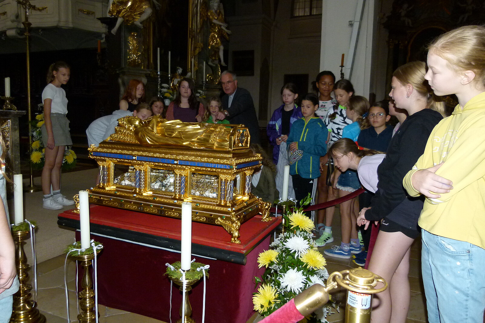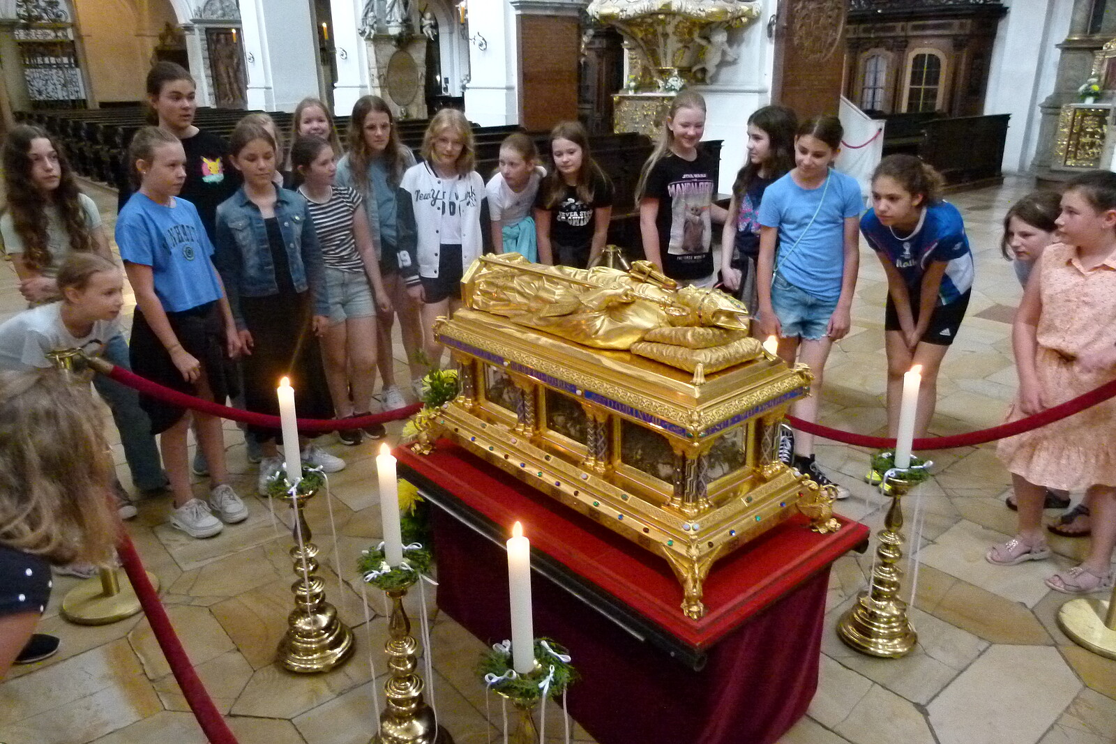 Freilich durfte zum Abschluss auch ein Unterrichtsgang nach St. Emmeram nicht fehlen, um den prachtvollen Reliquienschrein des Bistumspatrons zu sehen und damit zu lernen, wer sein Leben Gott zur Verfügung stellt, erlangt zeitlosen Ruhm und die Heiligkeit bei Gott dafür!