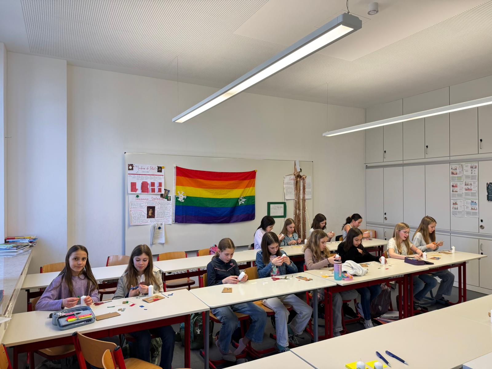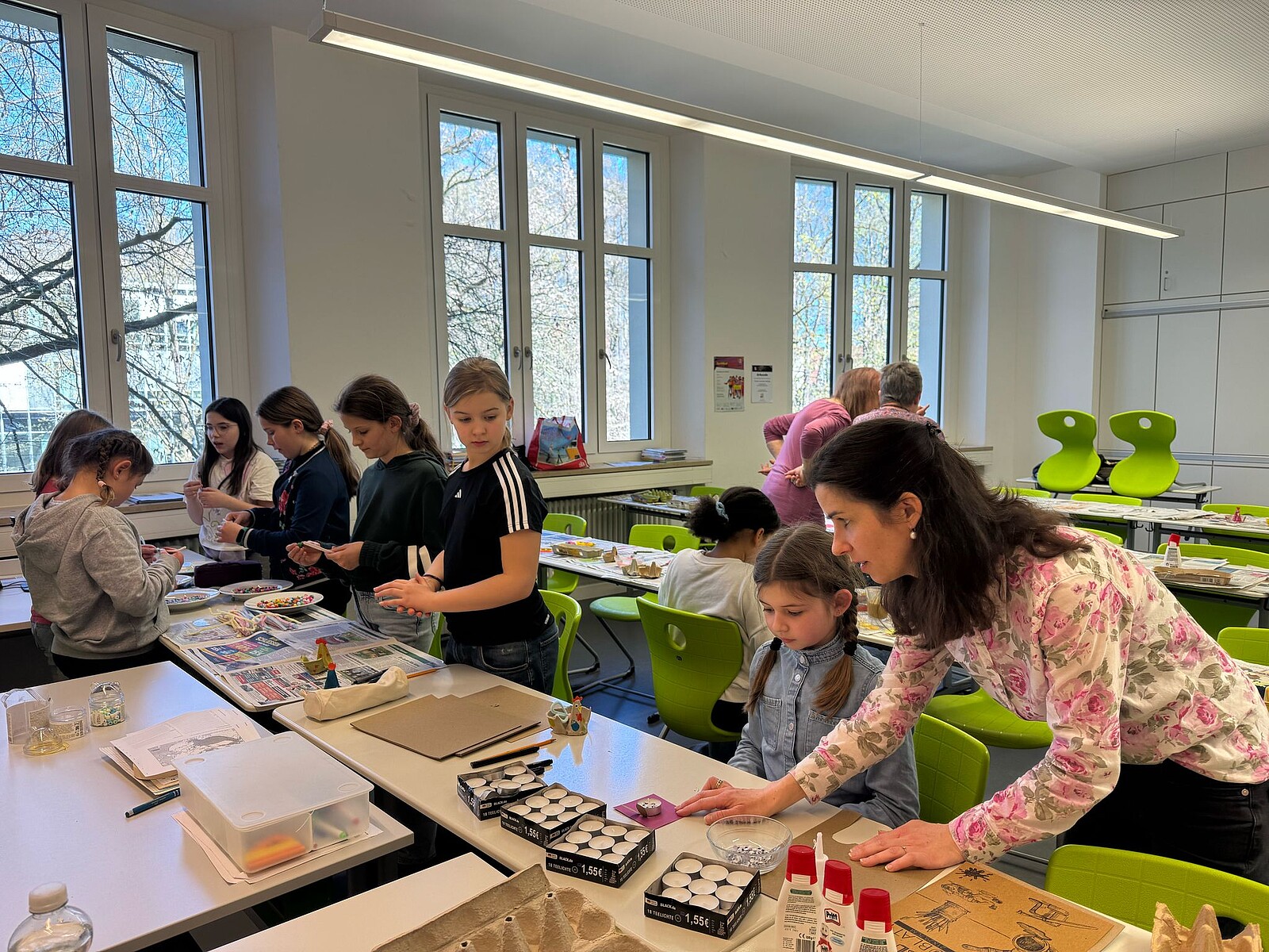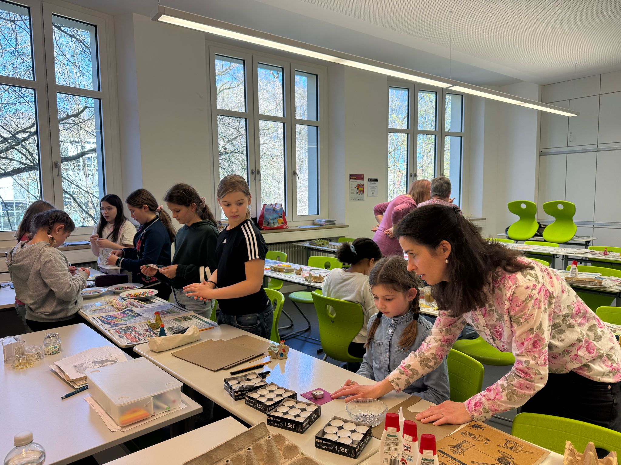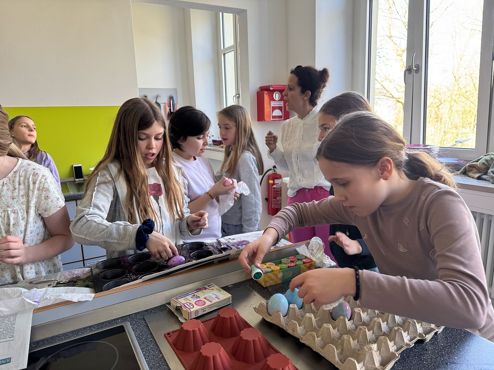 Im April fand unsere alljährliche Osteraktion statt - dieses Mal mit den 5. Klassen von Gymnasium und Realschule. Zusammen mit den Förderkreis-Mitgliedern wurde fleißig gebastelt, gebacken und Eier gefärbt. Die Mädls hatten eine aufregenden und bunten Nachmittag. Beim Gottesdienst mit Herrn Pfarrer Albert wurden die kreativ gestalteten Osterkerzen geweiht. Wir freuten uns über die zahlreiche Teilnahme und die eifrige Mitarbeit unserer Mädls. Es war wie immer eine gelungene Aktion.