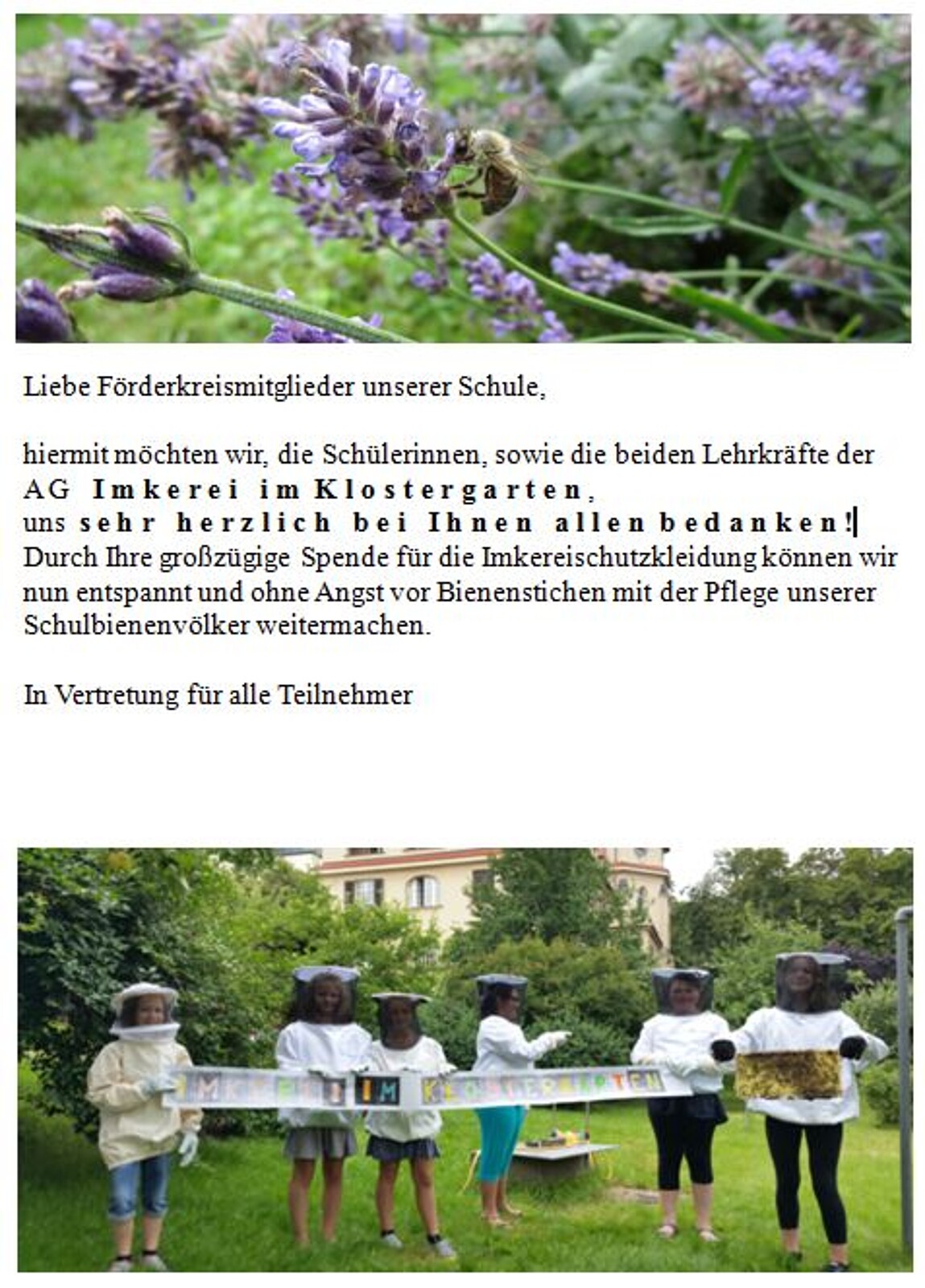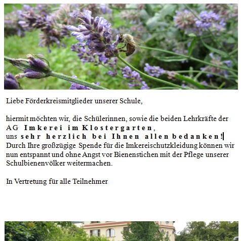 Bezuschussung von Bienen-Schutzkleidungen für das Wahlfach Imkerei