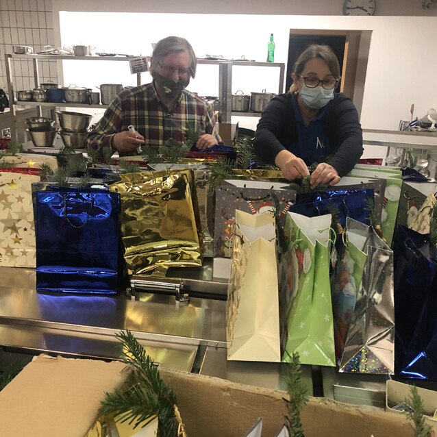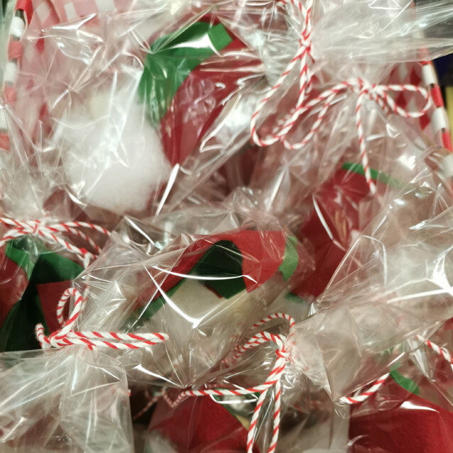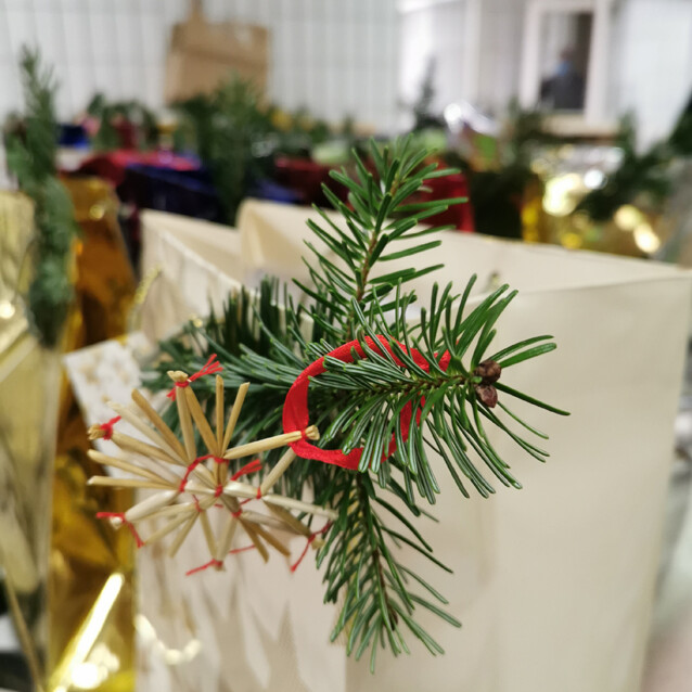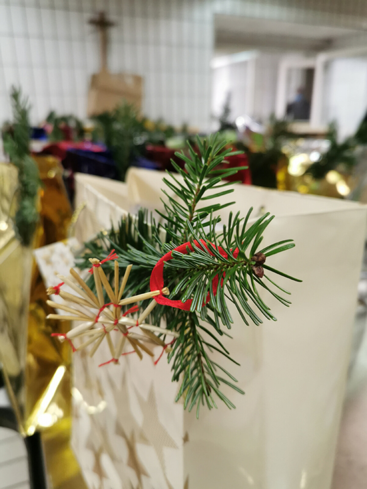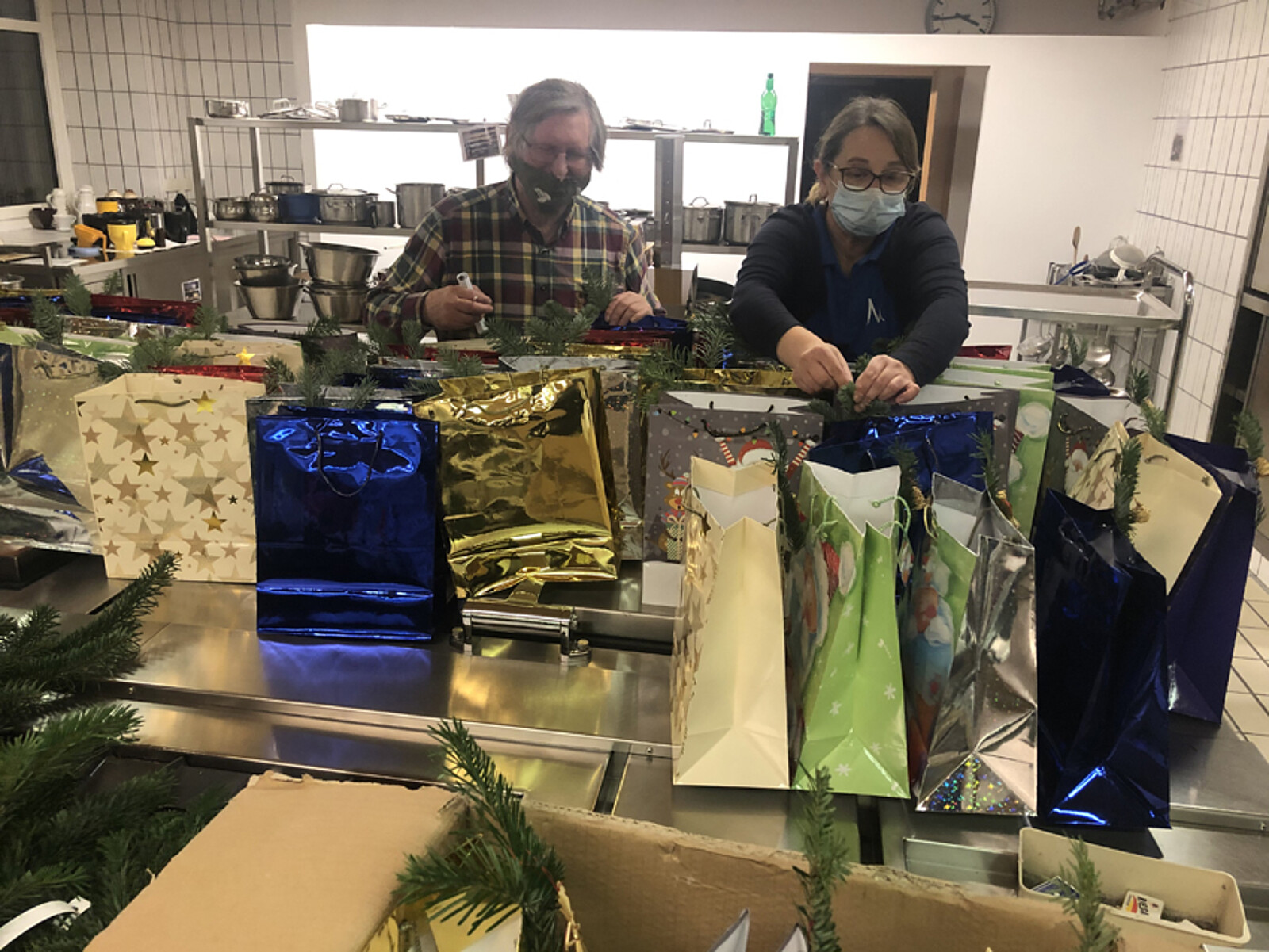 Am Donnerstag liefen die Vorbereitungen auf Hochtouren. Die fleißigen Mitglieder des Förderkreises haben in stundenlanger Kleinstarbeit alle Teile für die Weihnachts-Tüten vorbereitet. Insgesamt durften wir stolze 73 Tüten packen! Eine enorme Zahl. Plätzchenteig musste in die Gläser, Förmchen an die Rezepte und kleine grüne Zweige an die Verpackung. Danach musste die Bastelaktion einzeln verpackt in die Tüte. Zum Schluss wurden diese mit Strohanhängern verziert.