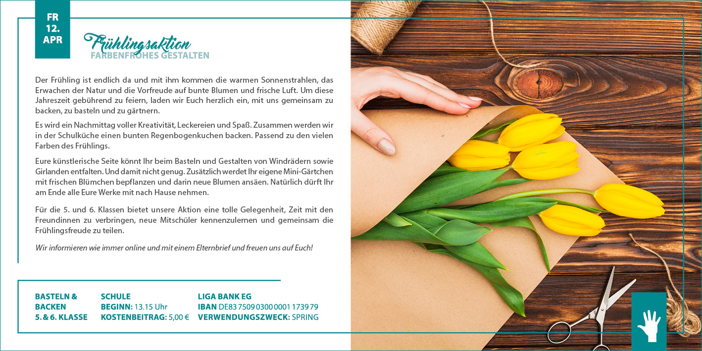 Es wird ein Nachmittag voller Kreativität, Leckereien und Spaß. Zusammen werden wir in der Schulküche einen bunten Regenbogenkuchen backen. Passend zu den vielen Farben des Frühlings.