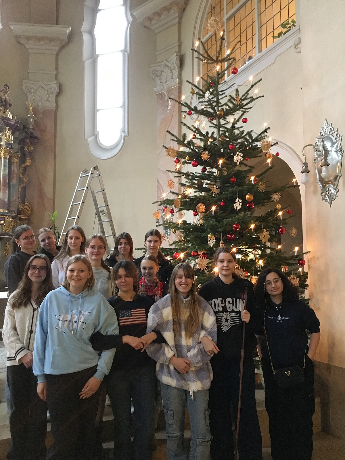 Die Klasse G 11A schmückte – mangels Mesnerin wie in den Tagen der Klosterfrauen! – den Christbaum und bereitete das Gotteshaus mit Pfarrer Albert vor;