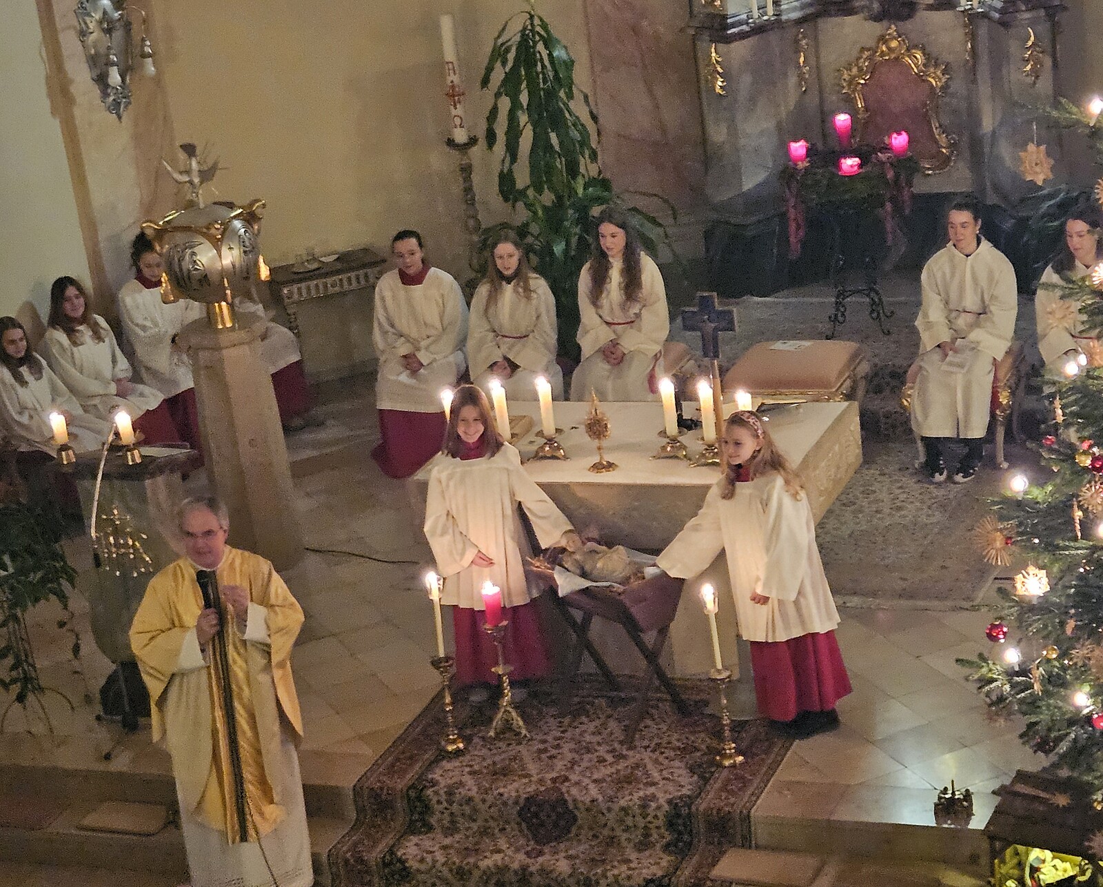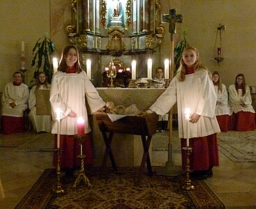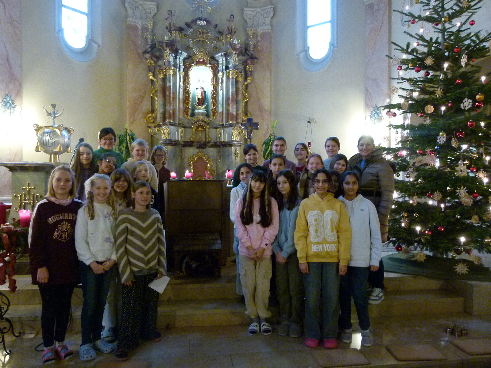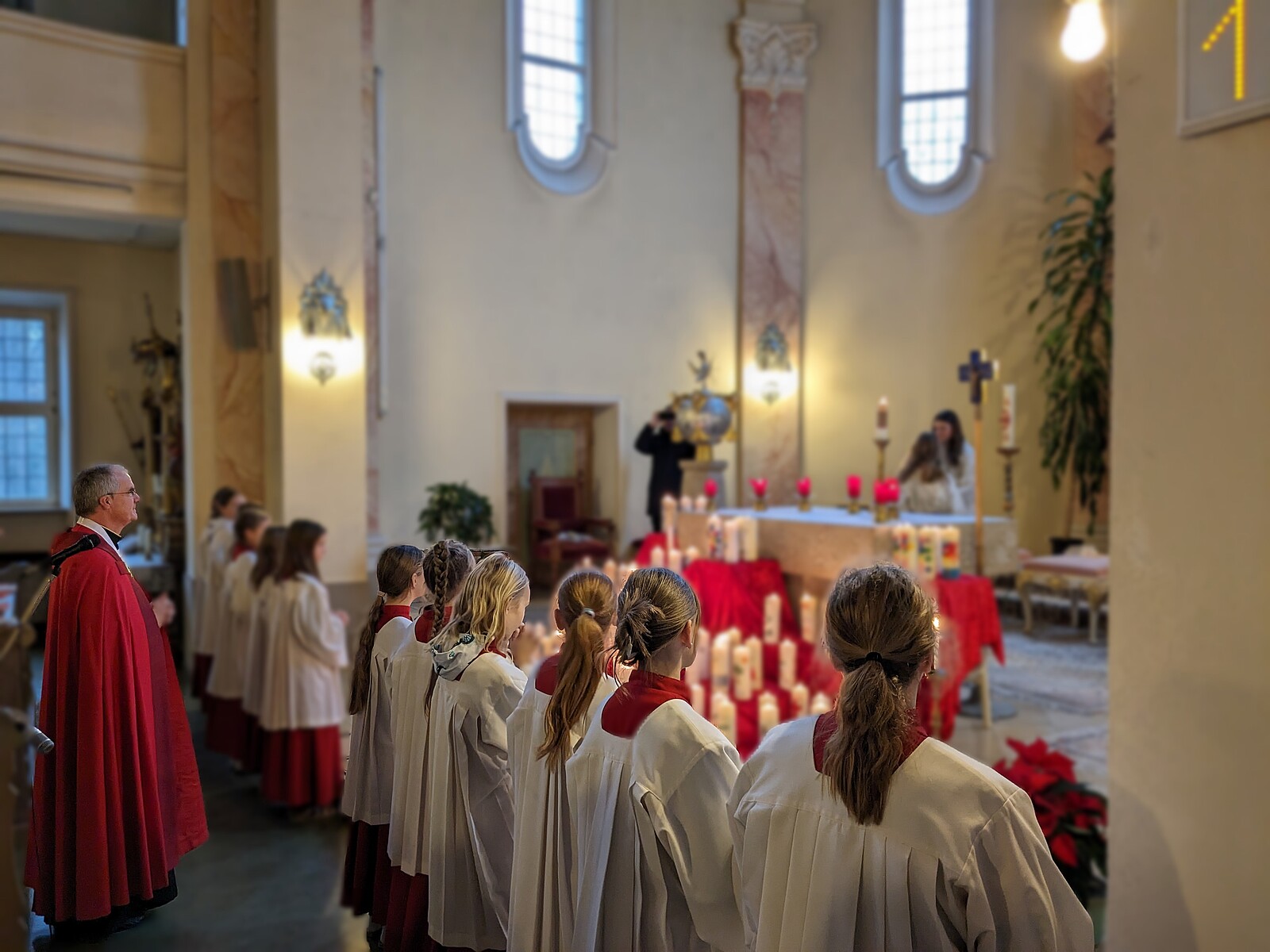 „Das gibt es so nirgendwo...!“ Dieses Zitat stammt von Dr. Peter Nothaft, dem Leiter des Katholischen Schulwerks in Bayern, gegenüber Domvikar Albert im Blick auf die Christmette der Schulgemeinschaft am Heiligen Abend. Und in der Tat waren heuer wieder ca. 450 Gläubige – Ehemalige und gegenwärtige Schülerinnen mit ihren Familien! – der Einladung in die Schul- und Institutskirche gefolgt. „Um Nachsicht bitten wir, dass wir circa 70 Absagen erteilen mussten...“ so der Schulseelsorger, „aber mehr lassen die räumlichen Gegebenheiten sinnvoll einfach nicht zu!“