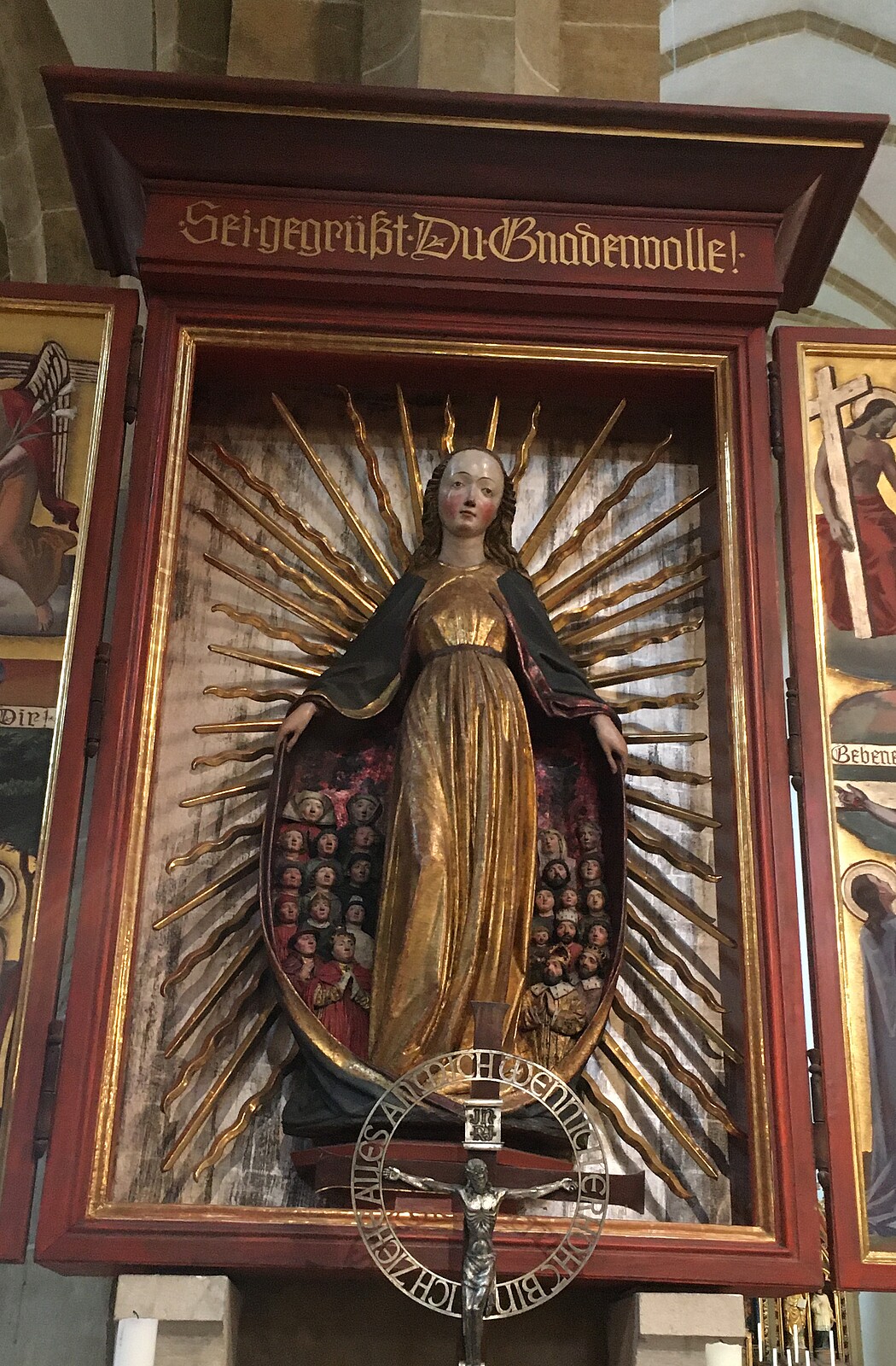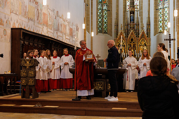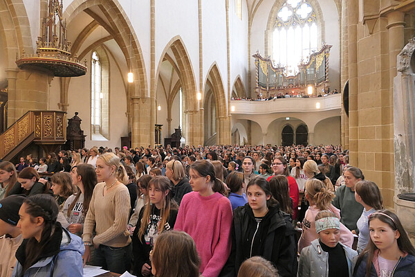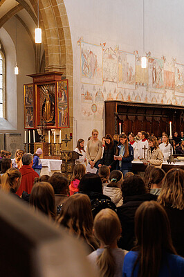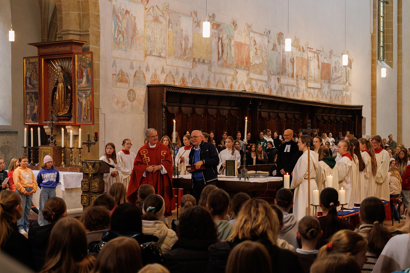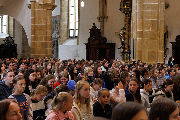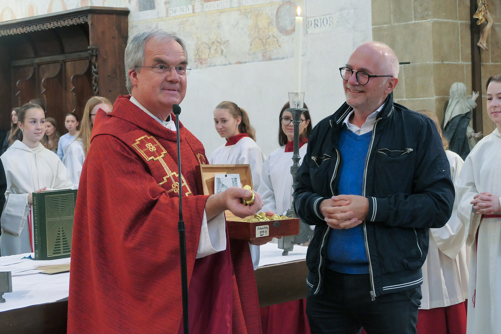 Nach vielen Jahren startete die Schulfamilie der „Englischen“ wieder mit einer Eucharistiefeier in der frisch renovierten Dominikanerkirche. Die mehr als 1000köpfige Gottesdienstgemeinschaft begrüßte dabei den neuen Schulleiter OStD Markus Birner in ihrer Mitte. Symbolisch für die Schülerinnen übergab Domvikar Andreas Albert dem neuen Direktor ein Schatzkästchen mit Goldstücken. Diesen Schatz gelte es in den nächsten Jahren zu hüten, pflegen und mehren! Oberstudiendirektor Birner zeigte sich beeindruckt von der gewaltigen Schulfamilie und versprach sein Bestes! Der Gottesdienst wurde von den Chören der St. Marien-Schulen u.a. mit der Mary-Ward-Messe unter der Leitung von Angelika Wimmer und Maestro Thomas Humbs an der Orgel eindrucksvoll gestaltet. Zahlreiche Ministrantinnen, Leserinnen aus der G 10A, Pfarrer Müller und Schulseelsorger Andreas Albert führten durch die Liturgie zu Ehren der Schutzfrau Maria, der die St. Marien-Schulen vom Jahr 1903 an geweiht sind. Dabei verwies Pfarrer Albert in der Predigt darauf, dass die Dominikanerkirche in Regensburg der ältesten Bildungseinrichtung der Bischofsstadt entspricht. Bereits im 13. Jahrhundert hatte hier der hl. Albertus Magnus als Universalgelehrter seinen Lehrstuhl. Später wurde in dieser Tradition angrenzend das “Alte Gymnasium“ (heute Albertus-Magnus Gymnasium) gegründet, das ursprünglich nur Knaben offen stand. Seit 1916 an unserer Schule das erste Abitur an einer Mädchenschule in Bayern abgelegt wurde, stehen unsere Mädels dem sowohl im Gymnasium als auch in der Realschule in nichts nach. Dabei wurde zu allen Zeiten Maria als Patronin angerufen, unter deren Schutzmantel Regensburgs Lernende und Lehrende gut durch die – nicht immer einfachen – Zeiten gekommen sind. Abschließend überreiche Domvikar Albert dem neuen Schulleiter eine Kopie des Gnadenbildes in der Dominikanerkirche mit dem Wunsch einer guten und erfüllten Zeit an nunmehr „seinen Englischen“!