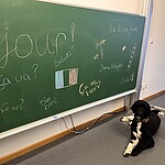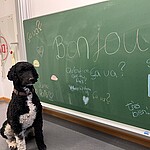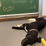 Das konnte ich auch alles schon unter Beweis stellen! Im Sommer 2022 haben mein Frauchen Frau Wildgen und ich gemeinsam die Schulhundausbildung gemeistert! Wir haben viel gelernt und sind auch ordentlich auf die Probe gestellt worden, was ja auch wichtig ist, da wir zusammen im Team mit Kindern arbeiten. In der Schule komme ich sehr gut bei den Schülerinnen an und ich freue mich jedes Mal, wenn ich wieder mit darf. Für gewöhnlich bin ich zweimal die Woche mit im Unterricht – bei Prüfungen muss ich zu Hause bleiben, um die Schülerinnen nicht abzulenken. Aber ich glaube ich habe eher eine beruhigende Wirkung. Nach der freudigen Begrüßung jeder einzelnen Schülerin im Klassenzimmer liege ich meist vorne bei der Tafel und beobachte neugierig den Unterricht.