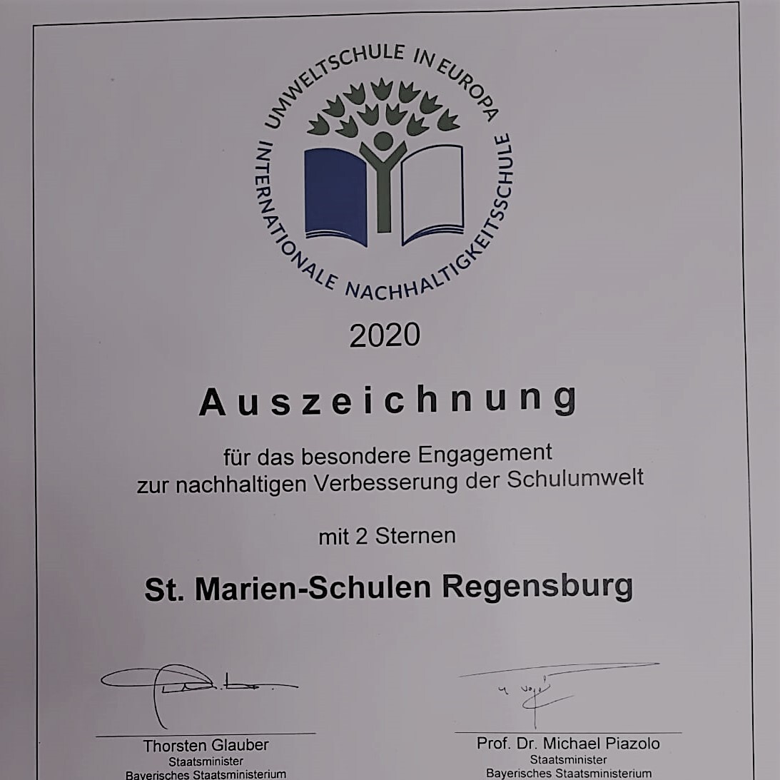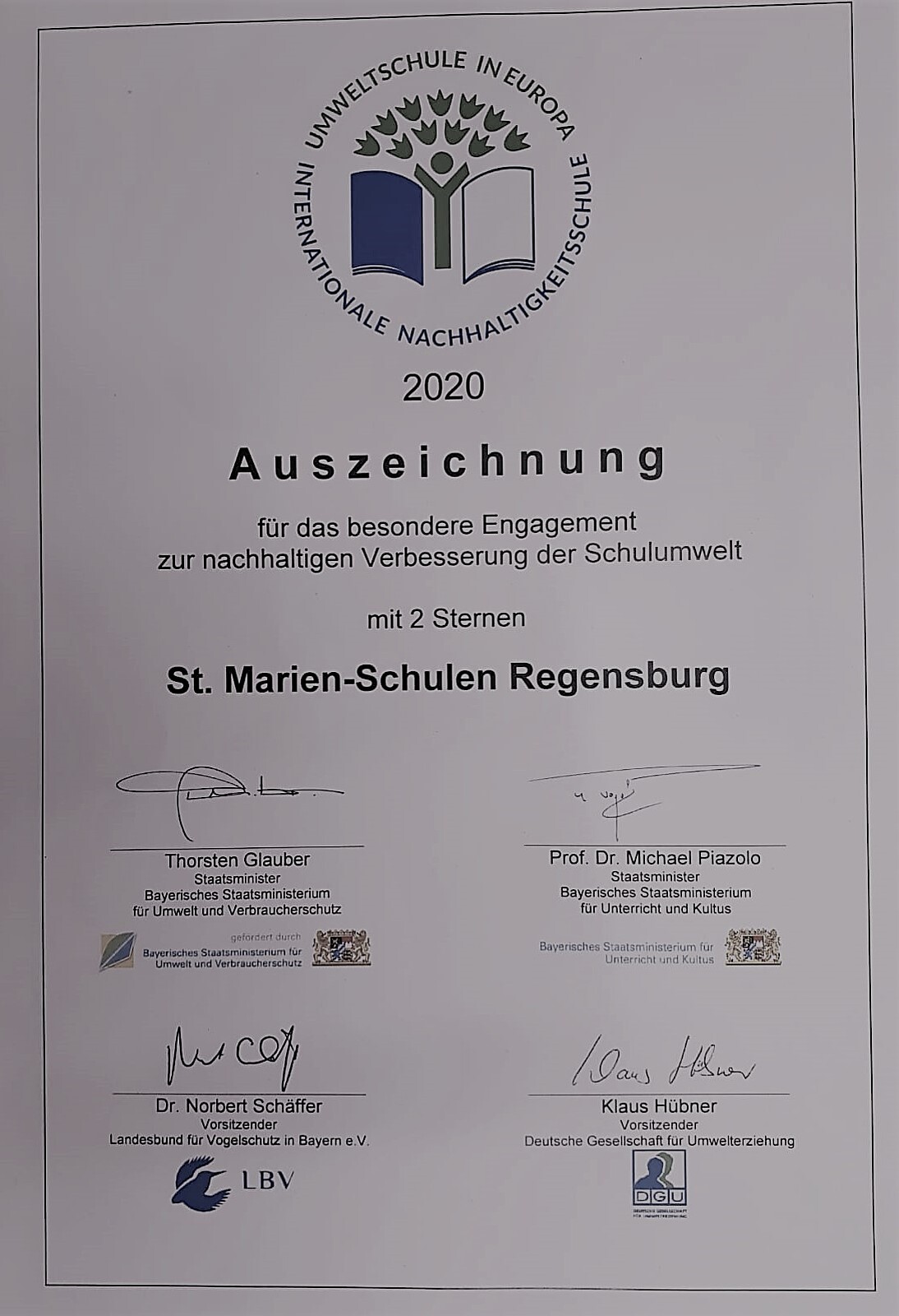 wir freuen uns, Ihnen mitteilen zu können, dass Sie die Auszeichnung „Umweltschule in Europa / Internationale Nachhaltigkeitsschule“ für das Schuljahr 2019/2020 erhalten. Herzlichen Glückwunsch!