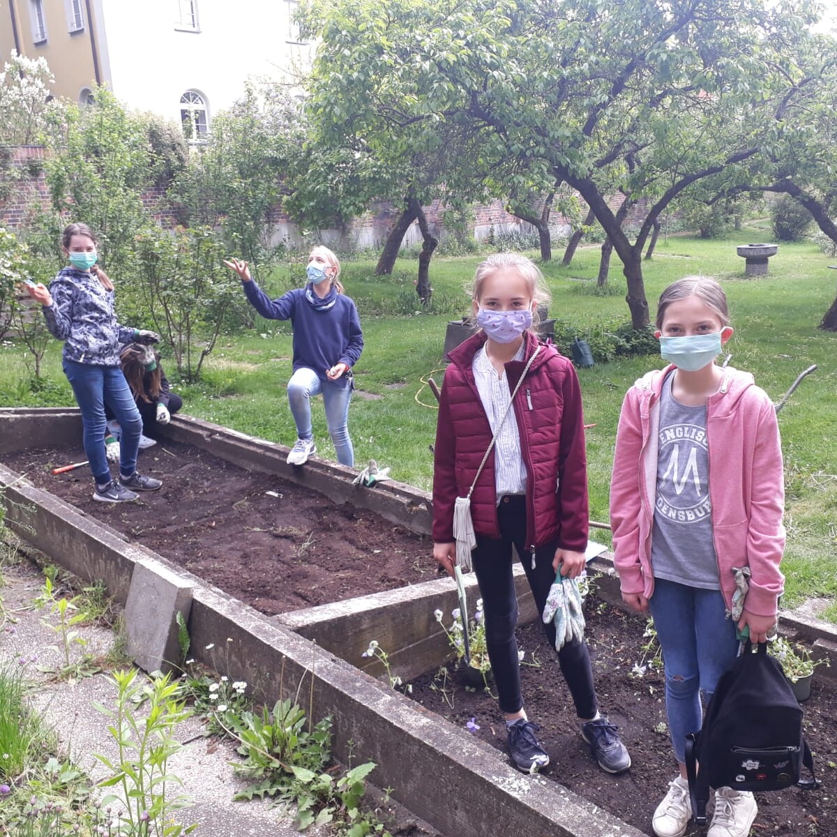 Seit dem Schuljahr 2019/2020 gibt es das Wahlfach Klostergarten, das eingerichtet wurde, nachdem die Klosterschwestern des Mary Ward Ordens unser Haus - damit auch die Pflege des Klostergartens - verlassen haben. Seit März 2021 nehmen wir an dem Bildungsprogramm Gemüse-Ackerdemie des Acker e.V. teil; unsere Ackerfläche umfasst mittlerweile 8 Gemüsebeete, auf denen in 2 Pflanzaktionen vielfältige Gemüse- und Salatsorten gesät und ausgepflanzt werden. Im März 2025 konnten wir unsere Frühbeete mit Frühbeetfenstern ausstatten, so dass eine längere Pflanzzeit möglich geworden ist.
