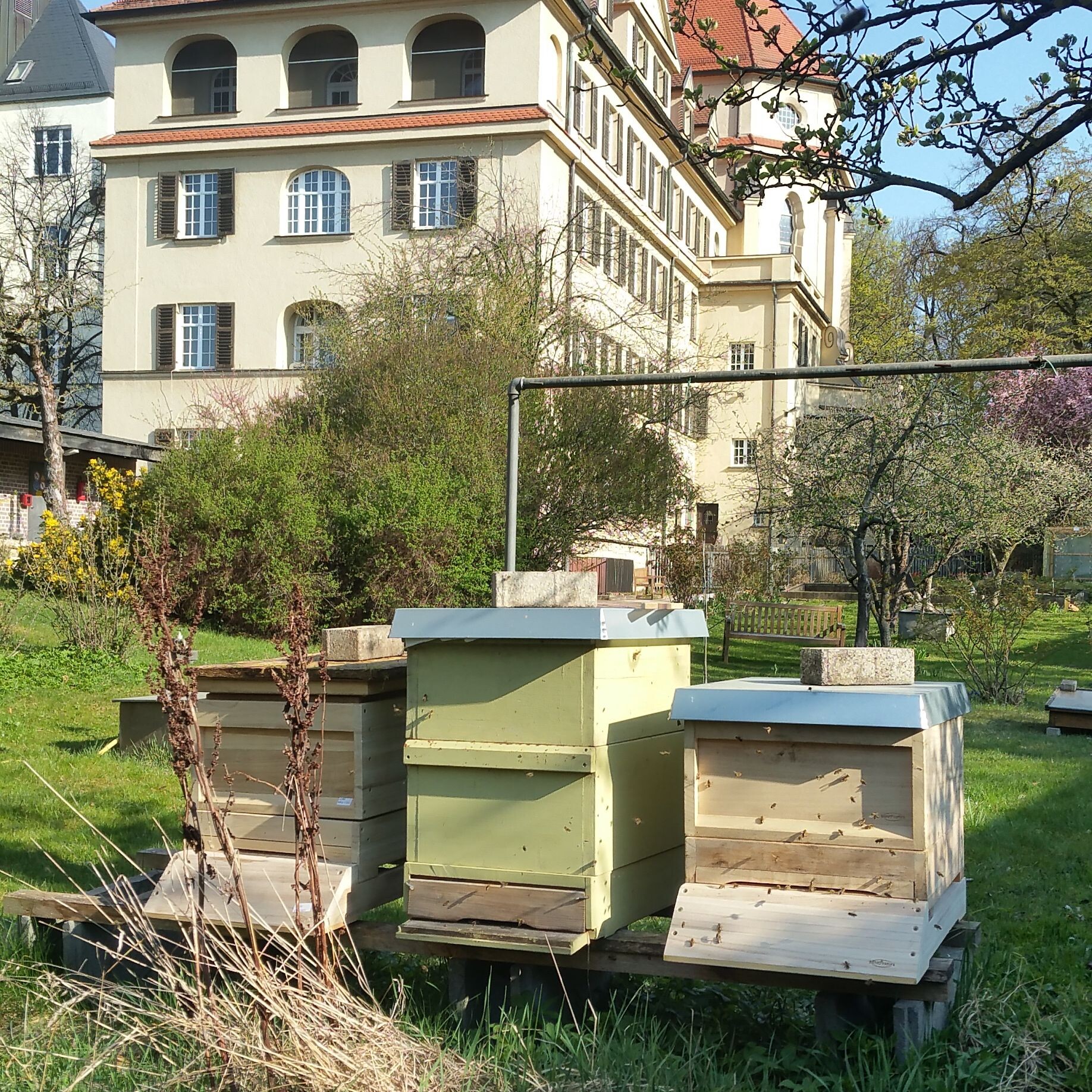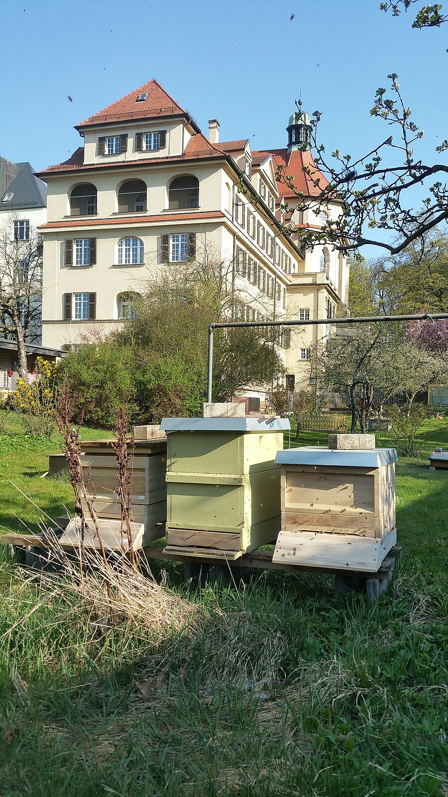 Nach nunmehr mehr als fünf Jahren Imkern im Klostergarten hat sich heuer (2021) zum ersten Mal ein Bienenschwarm in unserem Schulgarten auf einem Apfelbaum niedergelassen. Mit Hilfe eines Schwarmfangkorbes und einer Stange konnte er von mir, dem Schulimker Hermann Link, in eine Beute eingeschlagen werden. (siehe Video)Die Schülerinnen des Wahlfachs Imkerei im Klostergarten haben jetzt zu unser großen Freude ein fünftes Bienenvolk zum Betreuen.