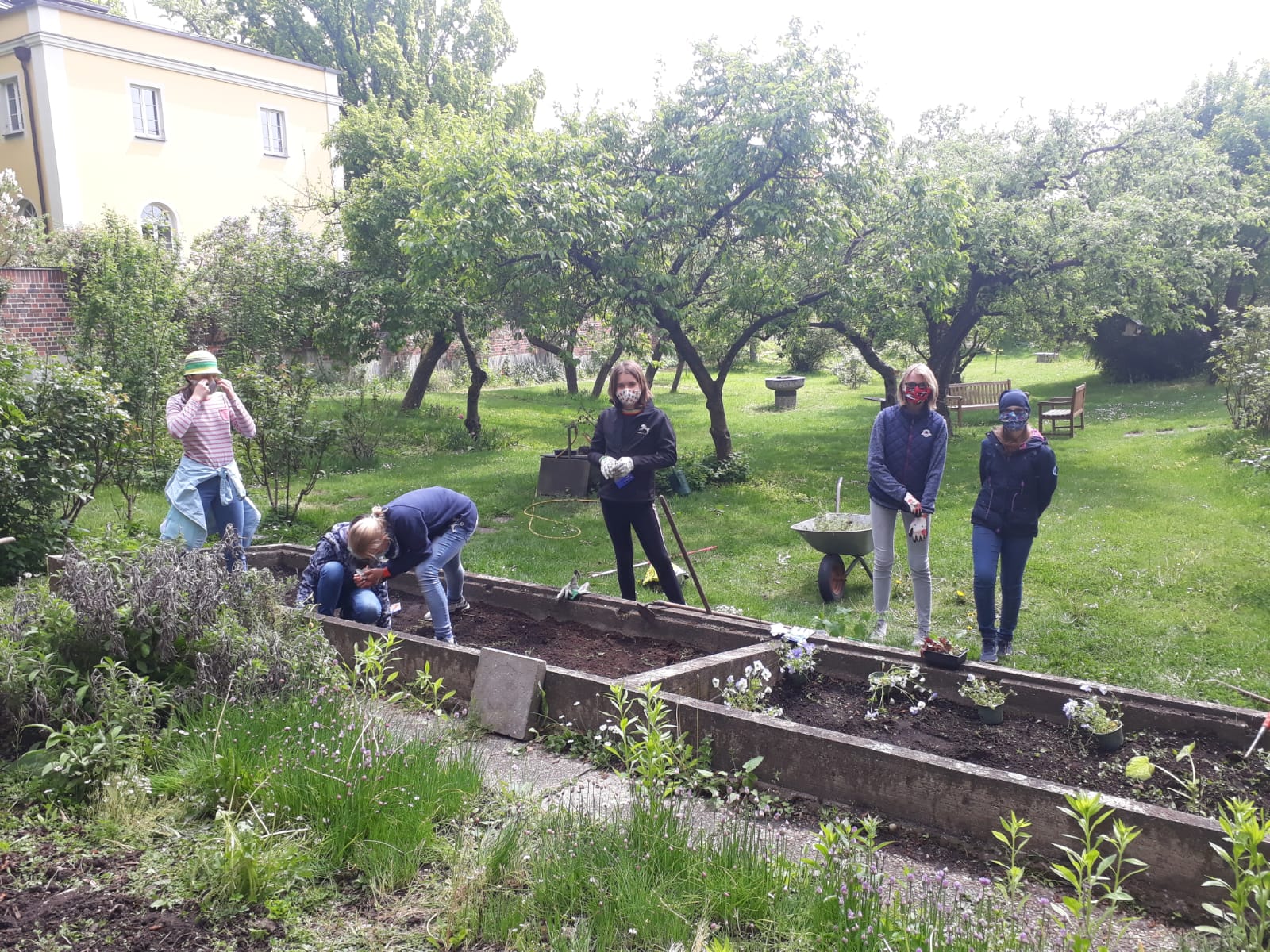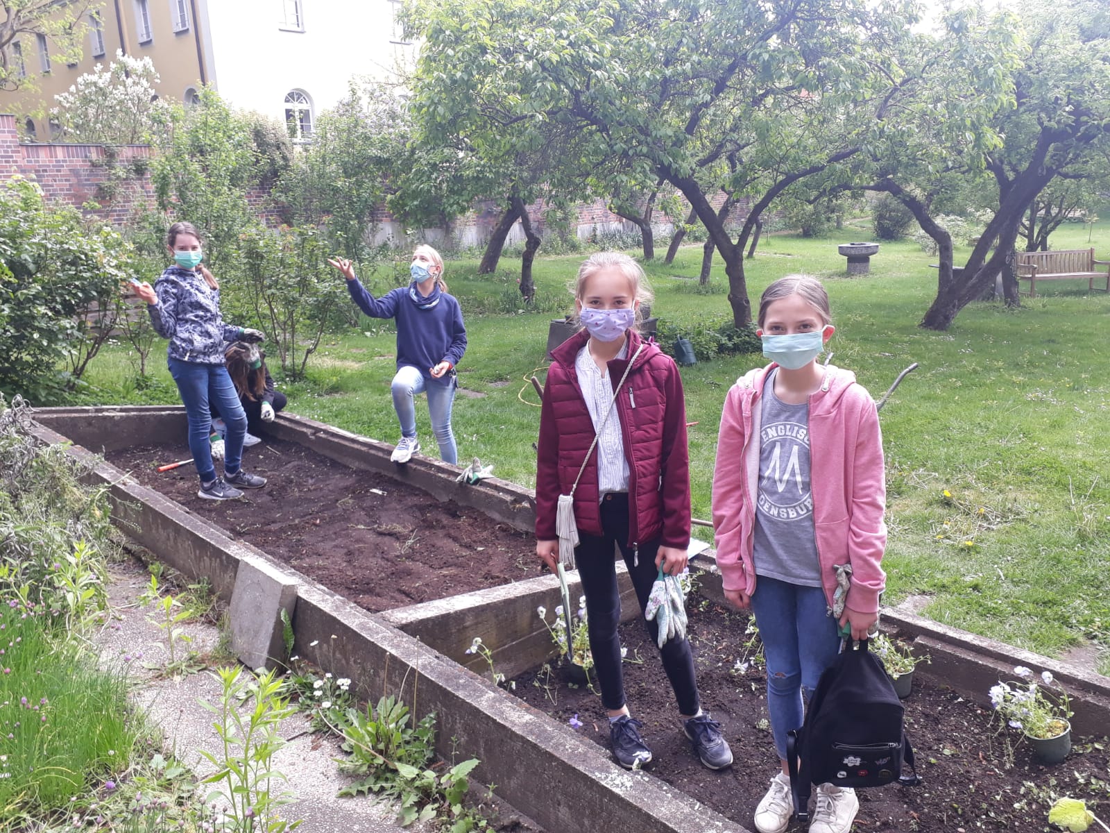 Jedes Jahr wählen ca. 15-20 Englische Gartenfeen aus den Jahrgangsstufen 5-8 beider Schulen dieses Wahlfach, um mit großem Elan gemeinsam im Garten zu arbeiten. Dabei ist die Aufgabenpalette groß: Unkraut jäten, die Beete abräumen, Saatgut und Gemüsepflanzen in das Beet setzen, pflegen und natürlich auch ernten. Durch das beständige, wöchentliche Arbeiten an dem Acker sind die Schülerinnen in den Wachstumsprozess der Pflanzen eingebunden. Sie müssen auch bei Hitze und Regen ihre Arbeitskraft den Pflanzen schenken und erfahren ganzheitlich – mit allen Sinnen – die Natur. Anders als im Schulunterricht können sie in dem Wahlfach mit ihren Händen arbeiten und etwas für die gesamte Schule bewirken. Die geernteten Gemüsearten werden z.T. an den Schulkoch Herrn Ebert und auch an die Schülerinnen des Wahlfaches weitergegeben.